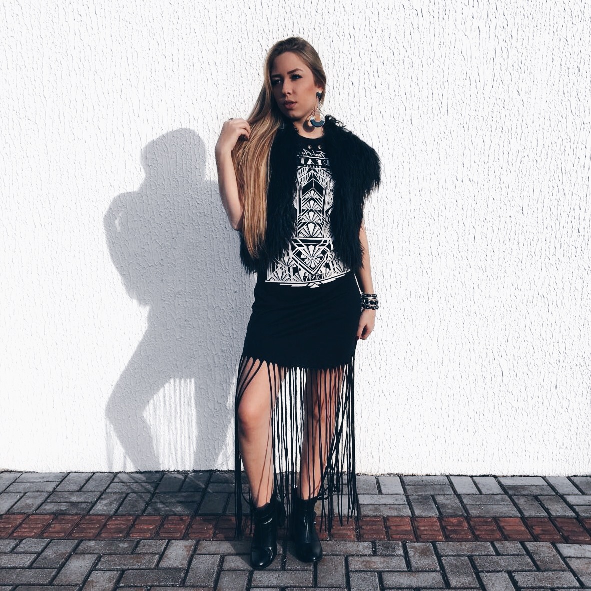 Olá pessoal! Para essa sexta feira temos um look poderoso para mostrar para vocês! Um vestido de malha com franjas e estampa mara da Dimy, marca que estou amando usar!!