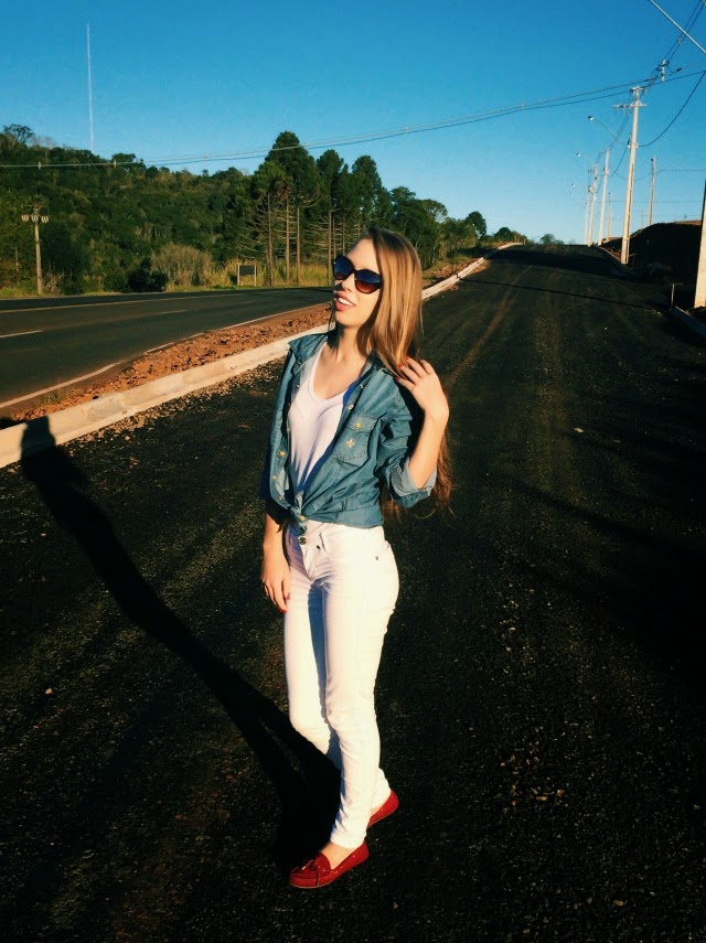 Hellooooo!! Fico tão animada em mostrar looks para vocês, ainda mais esses mais casuais, tão difíceis de fotografar! Então fiquem com essa produção bem básica, baseada no branco e com detalhes marcantes: jeans despojado, óculos marcado por estampa e mocassim burgundy.